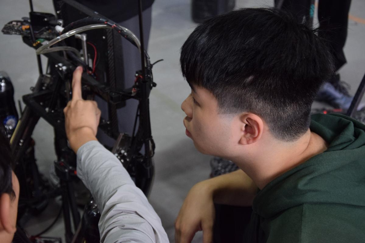 交流活动最后一站,同学们回归“全国机器人科创教育基地”的核心训练区,在基地内,我校校机器人队队员展示了2025年RoboCon赛事备赛机器人的机械结构、控制系统及调试流程,重点讲解了自主研发的“推射模块”“运球模块”“扣篮模块”等核心技术。来访的港校机器人队成员对这些核心技术表现出浓厚兴趣,双方就技术细节、优化方向等展开热烈讨论。
