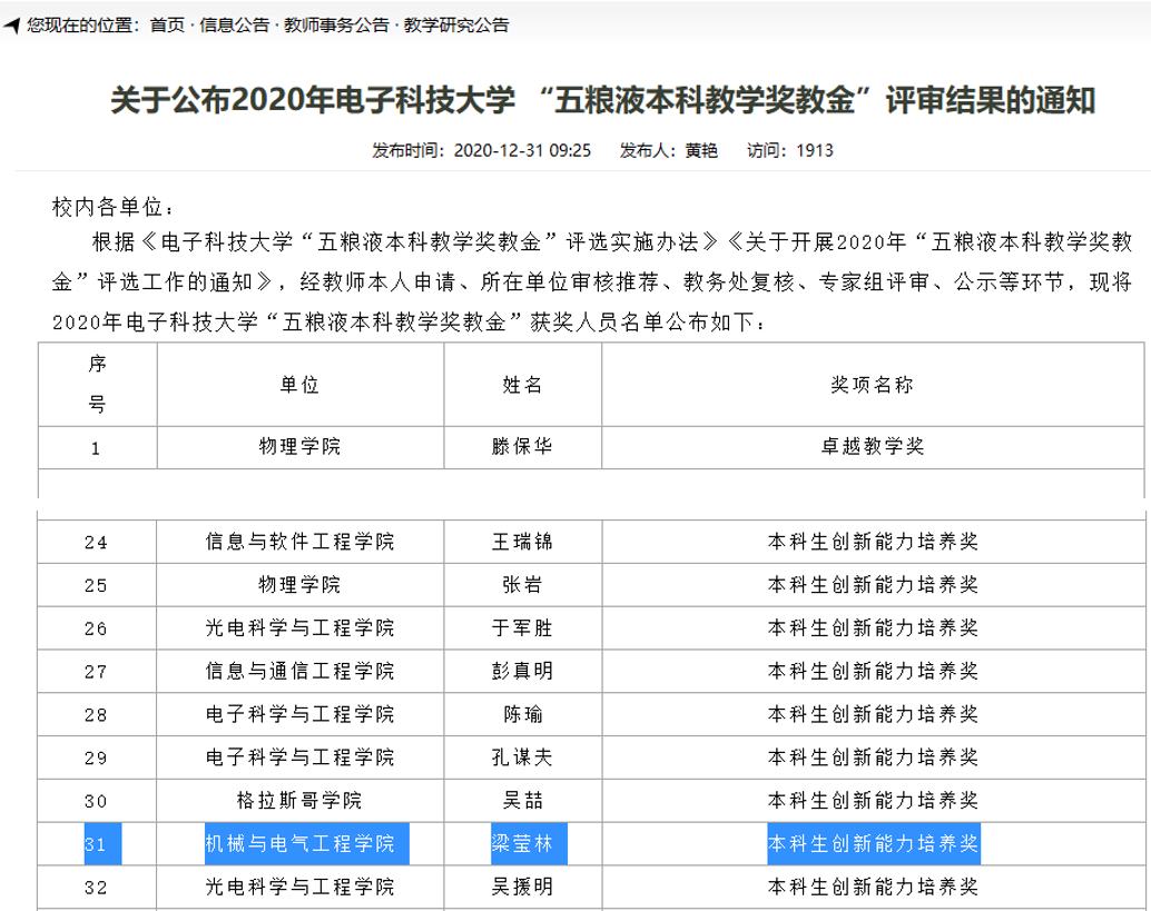 “五粮液本科教学奖教金” 本科生创新能力培养奖
